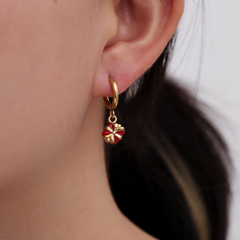 Klein, verspielt und einfach zum Verlieben – Léonie ist das goldene Detail, das jeden Look veredelt. Die Creolen aus vergoldetem Edelstahl tragen zarte Anhänger in Form kleiner Geschenk-Schleifen – glänzend, charmant und ein Hauch französisch verspielt.