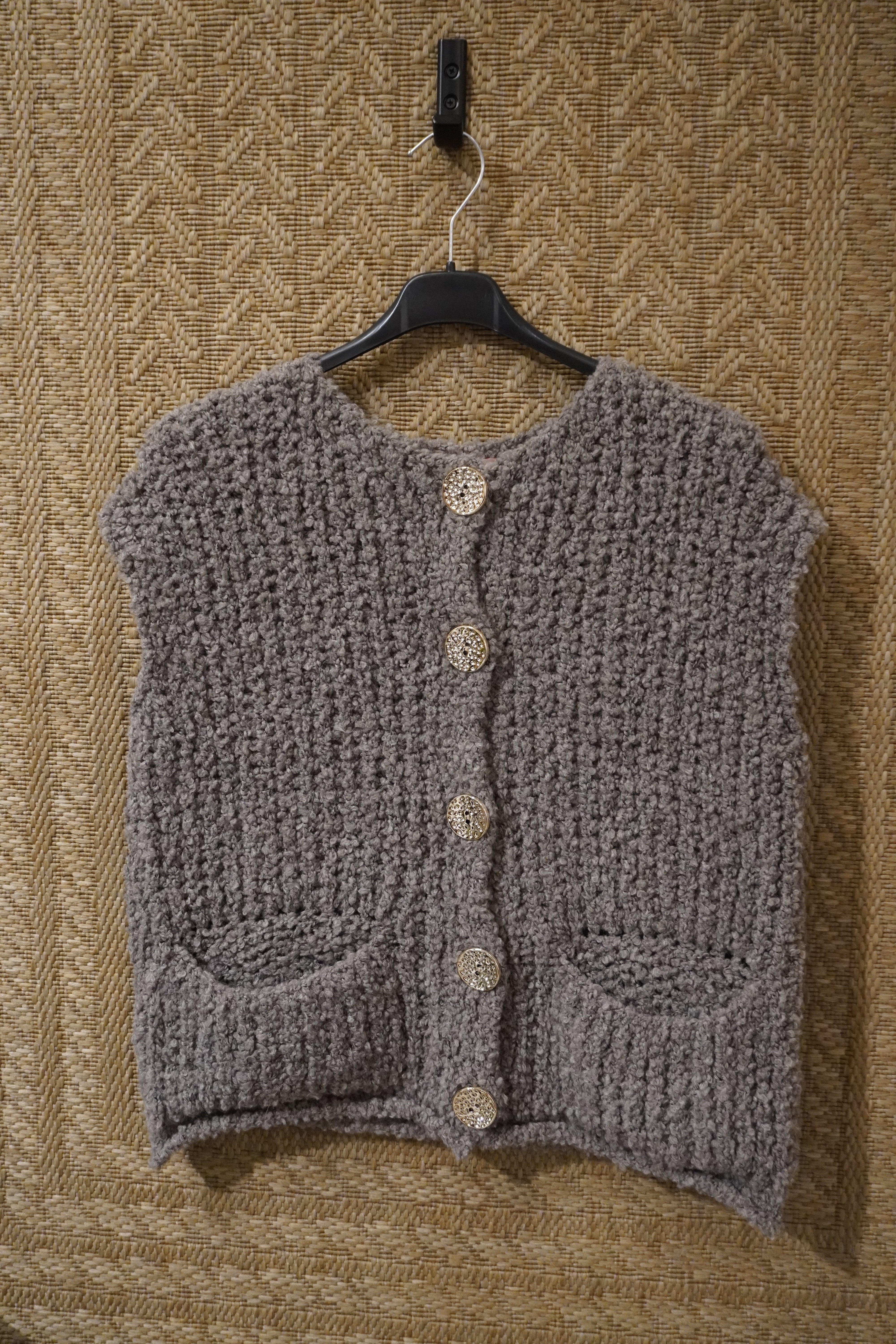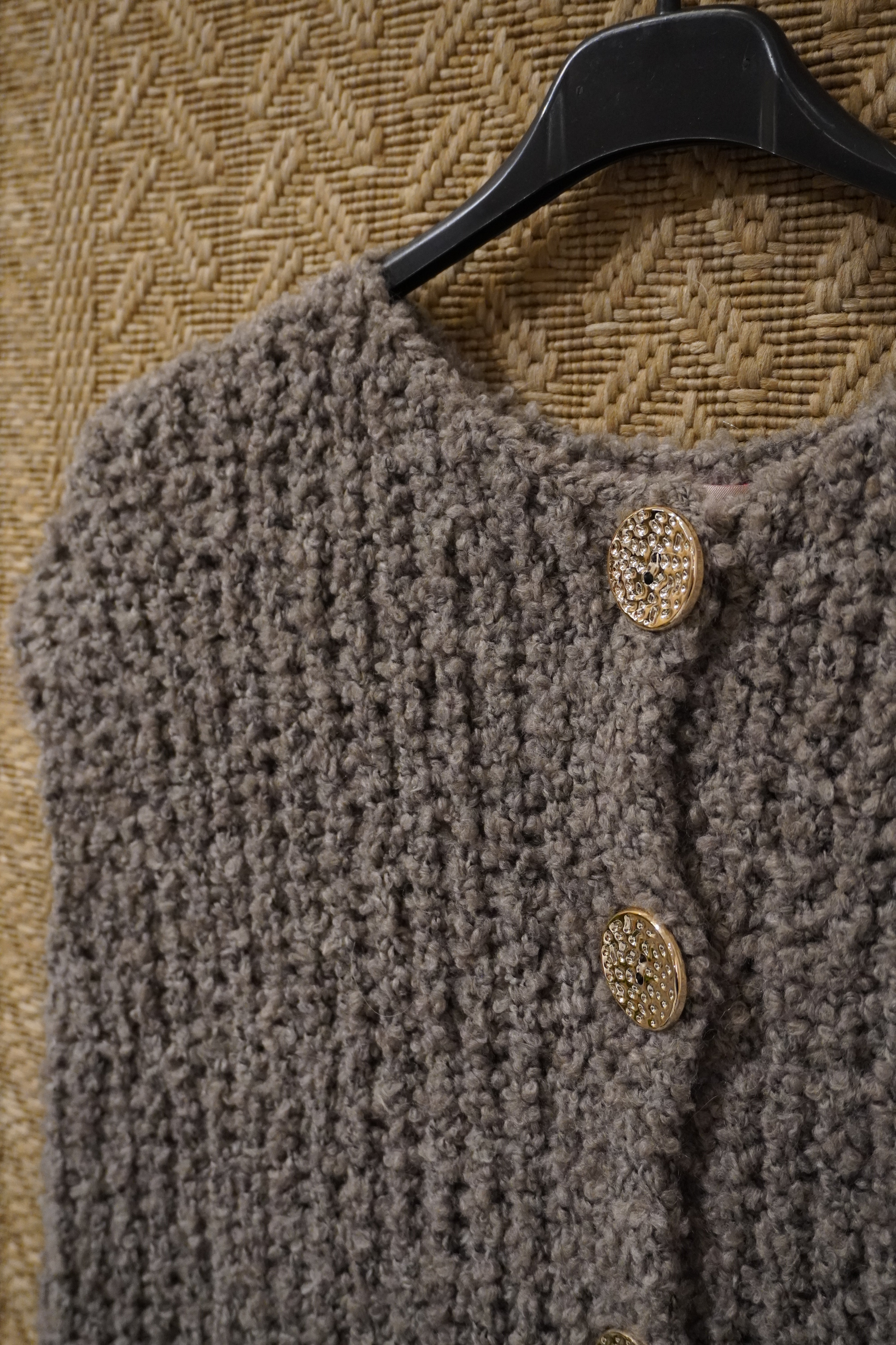Besonderheit: Grobstrick-Optik, goldene Zierknöpfe, aufgesetzte Taschen, rund geschnittener Halsausschnitt